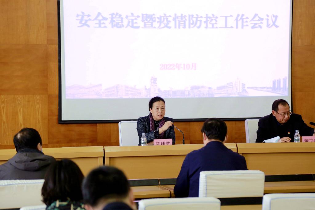 陳桂芝代表學校黨委就抓好黨的二十大期間學校安全穩定和疫情防控工作強調三點要求:一要提高政治站位,堅持高標準抓好安全穩定和疫情防控工作;二要落實安全責任,堅持高質量抓好安全穩定和疫情防控工作;三要合力齊抓共管,堅持高效度抓好安全穩定和疫情防控工作。