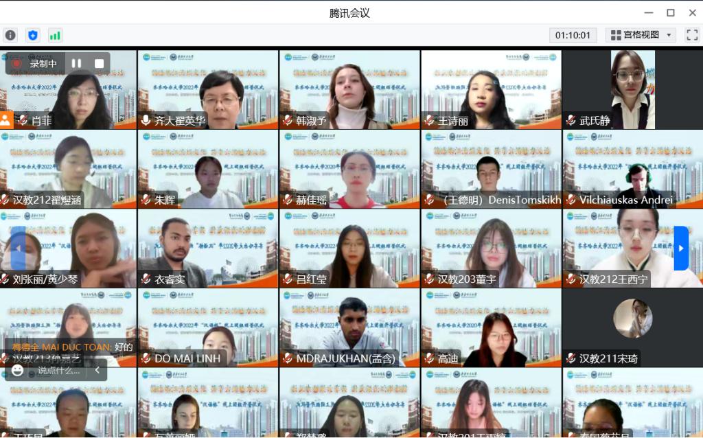 12月9日晚,由教育部語言交流合作中心主辦,我校承辦的“領略嫩江流域文化,共享云端魅力漢語”為主題的“漢語橋”線上團組交流項目圓滿結營。副校長張樹軍、學校相關部門及學院的領導、海外友好學校代表、授課教師、學生志愿者、以及來自俄羅斯、泰國、越南、韓國、巴基斯坦、孟加拉國、哈薩克斯坦等國200多營員相聚云端,共同回顧了本次漢語學習和文化體驗之旅。結營儀式由國際教育學院黨委書記胥軍主持。
