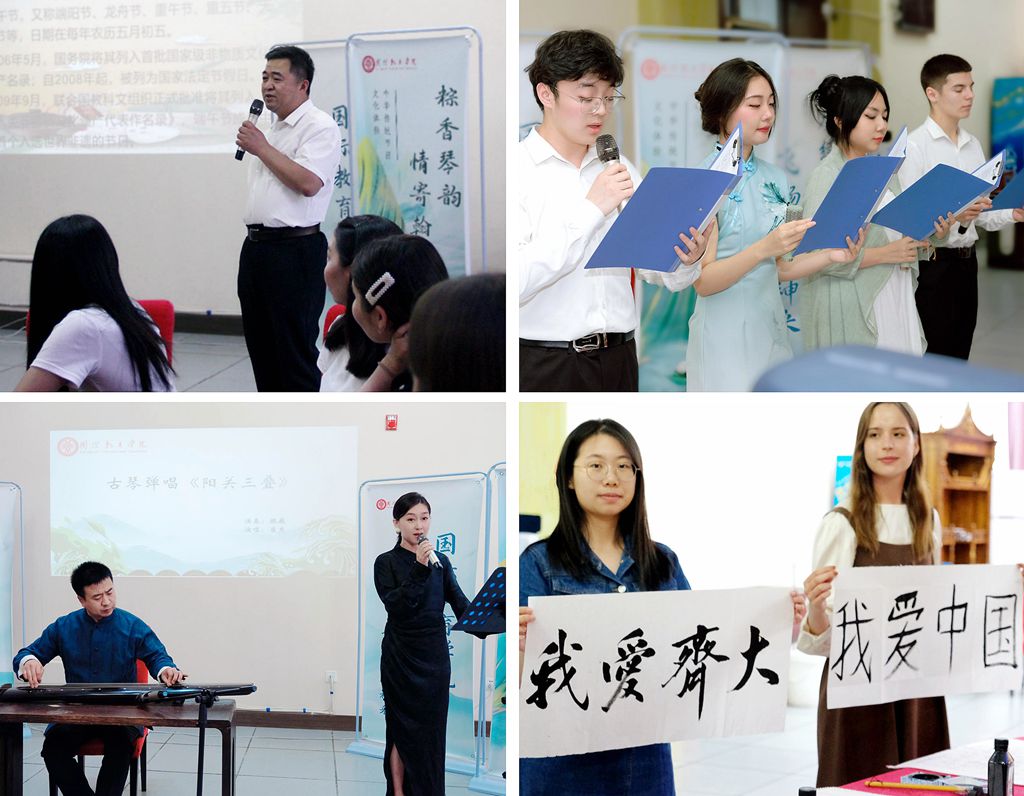 活動中,訾希坤老師向師生們介紹了端午節(jié)的起源和意義,留學(xué)生與中國學(xué)生分別用中英文朗誦了千年經(jīng)典《離騷》,市青年藝術(shù)家崔爽、魏巍為大家?guī)砹斯徘購棾蛾栮P(guān)三疊》,并與留學(xué)生互動實(shí)踐,撥動琴弦感受千年古琴文化的韻味。中外學(xué)生代表現(xiàn)場進(jìn)行了書法展示,進(jìn)一步感知中國文化、書寫中國情緣。