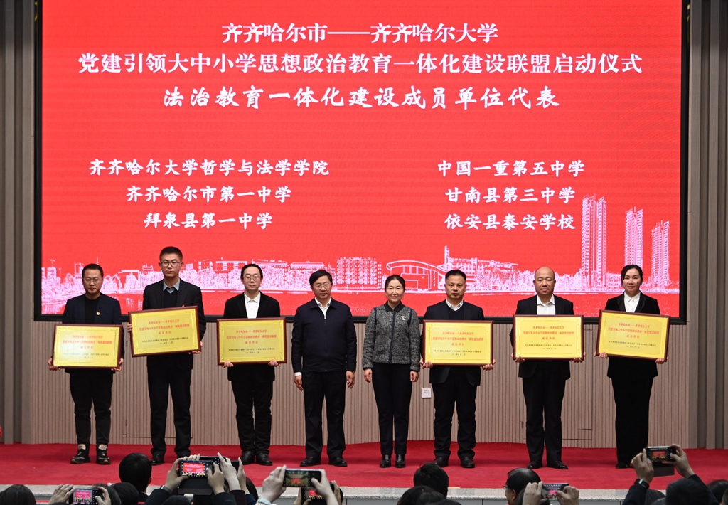 與會(huì)領(lǐng)導(dǎo)分別為“齊齊哈爾市—齊齊哈爾大學(xué)黨建引領(lǐng)大中小學(xué)思想政治教育一體化建設(shè)聯(lián)盟”成員單位代表授牌。