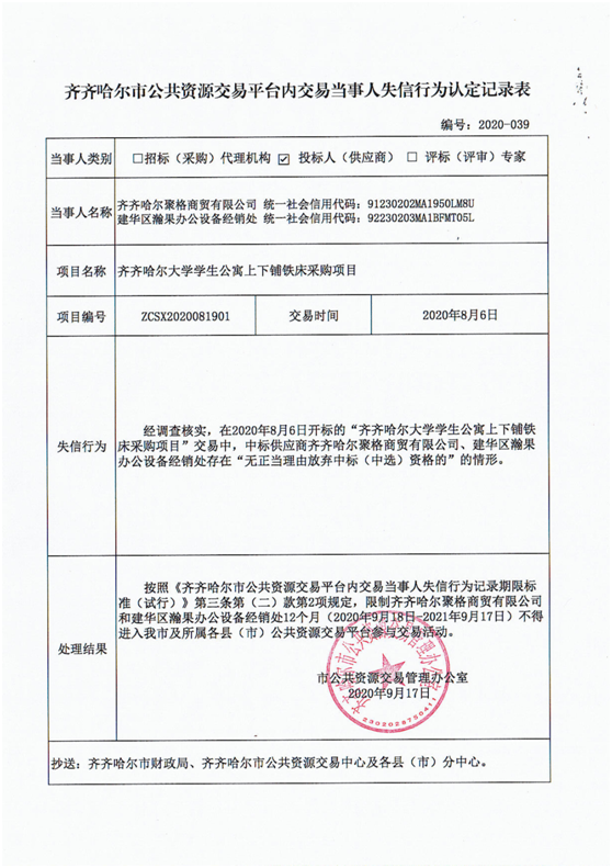 下一條:齊齊哈爾市公共資源交易平臺內交易當事人失信行為認定記錄表(轉自齊齊哈爾市公共資源交易中心網)