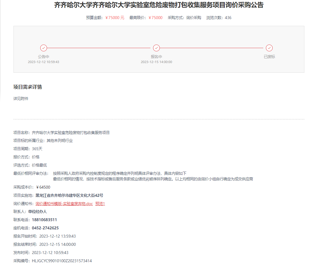 上一條:齊齊哈爾大學實驗室危險廢物打包收集服務項目(第2次)詢價采購公告(轉自黑龍江省政府采購網)
