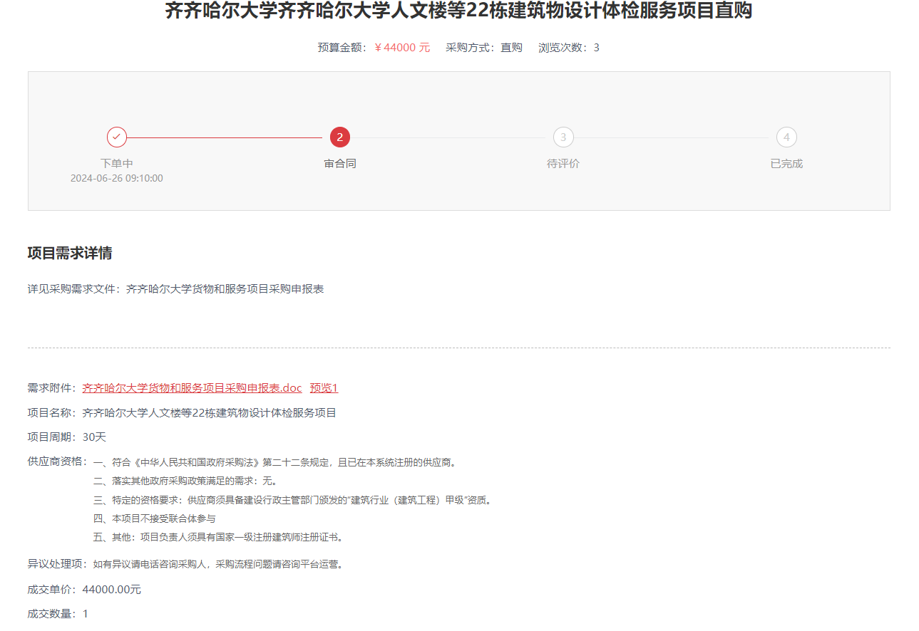 齊齊哈爾大學人文樓等22棟建筑物設計體檢服務項目直購(轉自黑龍江省政府采購網)