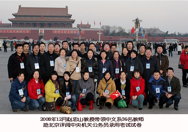 內強素質的同時還要外樹形象,2007年12月12日,應國家人力資源部邀請,他帶領36名中文系教師赴京評閱2008年中央機關公務員考試試卷,贏得了原國家人事部、各兄弟院校、兄弟單位的一致好評,為齊齊哈爾大學、齊齊哈爾市,乃至黑龍江省爭得了榮譽。2008年,趙忠山教授緊緊抓住慶祝中文系建系五十周年的契機,廣泛邀請社會各屆人士參與其中,廣泛聯(lián)系畢業(yè)生中有一定影響的學生積極為系慶作貢獻。2008年7月15日,在校領導的大力支持下,中文系成功舉辦建系五十年慶典活動,產(chǎn)生了良好的社會反響。多年來,中文系為我校教評創(chuàng)優(yōu)和創(chuàng)建省屬重點大學貢獻了力量,多次獲省、市、校的表彰和獎勵,被《光明日報》、《中國教育報》、《齊齊哈爾日報》等各大媒體熱忱報道。