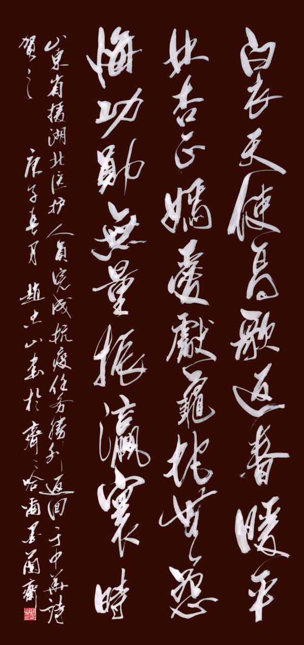 ——山東省援湖北醫(yī)護(hù)人員完成抗疫任務(wù)勝利返回,于中華詩賀之。庚子春月趙忠山書于齊齊哈爾墨蘭齋
