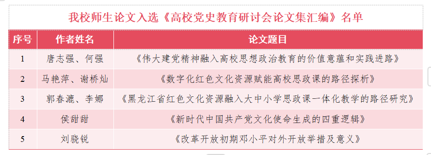 我校黨委宣傳部思想理論教育科教師唐志強,馬克思主義學院碩士研究生侯甜甜、劉驍銳應邀參加了本次研討會。同時,我校師生的5篇論文被《高校黨史教育研討會論文集匯編》收錄。